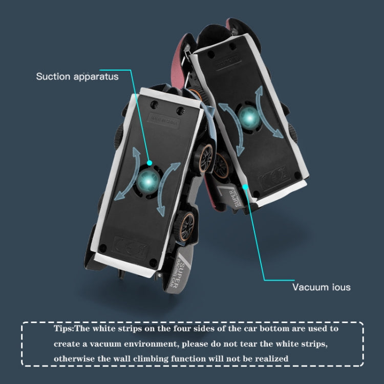2. The white strips on the four sides of the car bottom are used to create a vacuum environment, please do not tear the white strips, otherwise the wall climbing function will not be realized